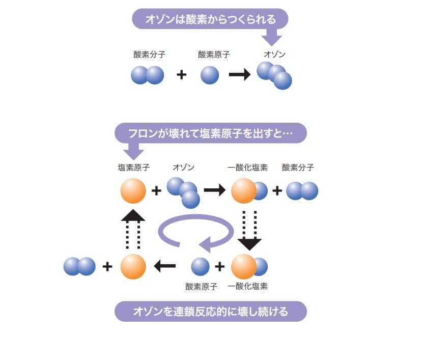 フロンが分解されるときには塩素原子が放出されますが、これがオゾンを分解するはたらきを持っているのです。
