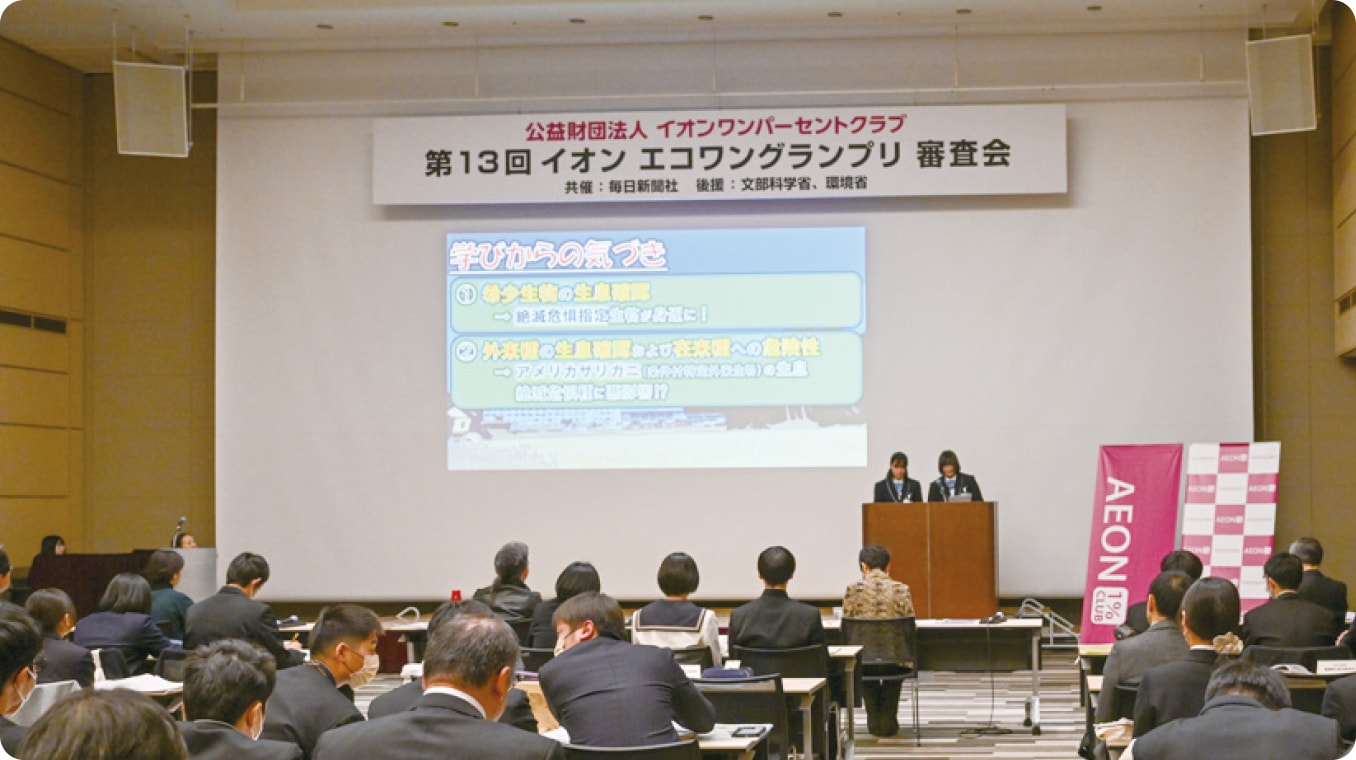 イオン エコワングランプリは、地球の未来を想う高校生が日ごろ取り組んでいる環境保全や社会貢献のための活動を発表し合うコンテストです。他校の発表を聞くことで、新たな行動のきっかけをつかみ、表現力や発信力を向上させることを目的に、2012年より開催しています。
